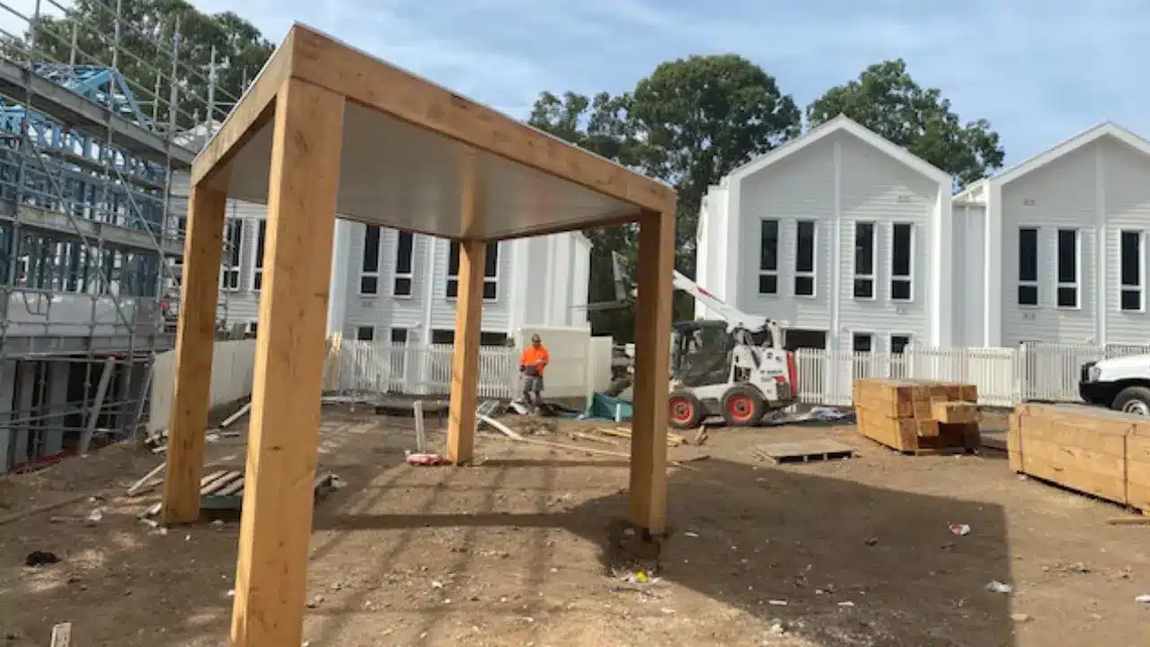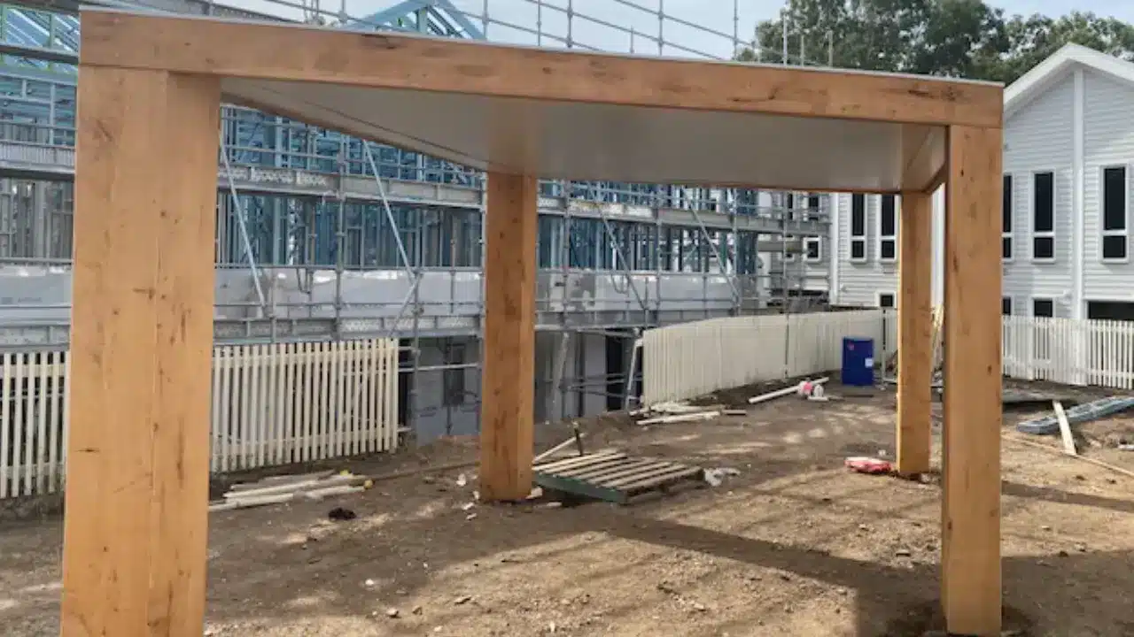 The Sunclipse insulated roofing panels increase comfort levels and the timber posts and facia provide natural elements to work with the planned landscaping.
