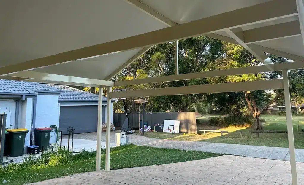 Featuring a gable design roof, the paperbark panels, posts and supports match the existing colour palette of the home. Provisions for a panel lift door were included for future upgrades.