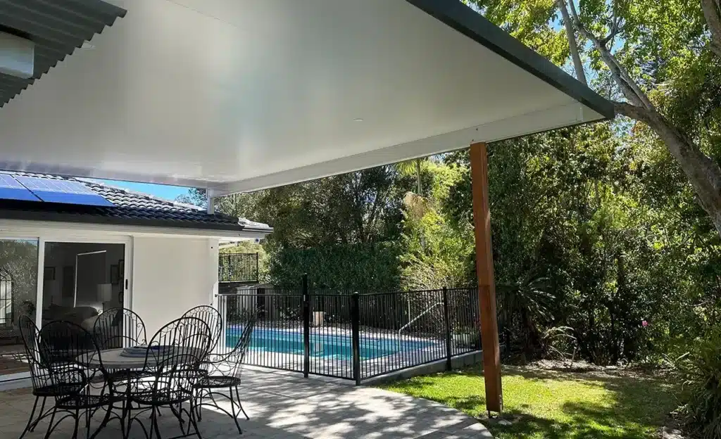 The elevated roof design uses a reverse pitch to open the outdoor space adding light and circulation. A through-eave post is colour-coded and strategically placed for an unobstructed view of the pool.