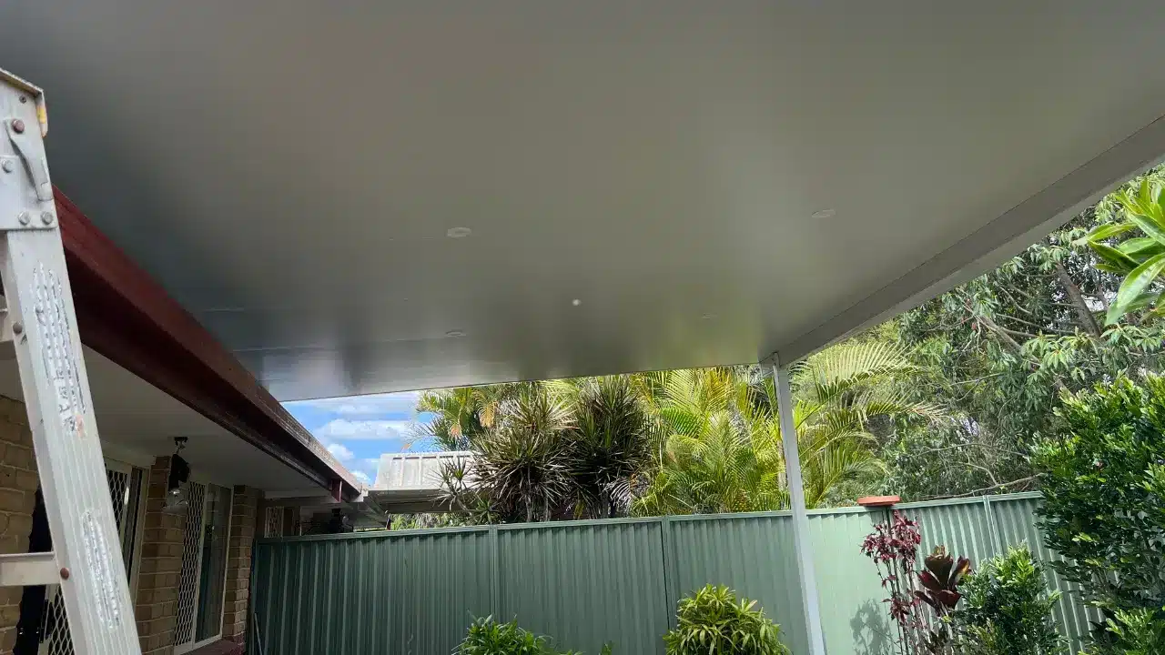 A crisp, clean insulated flyover patio designed and installed by our Brisbane team for our lovely clients in Fitzgibbon Queensland.