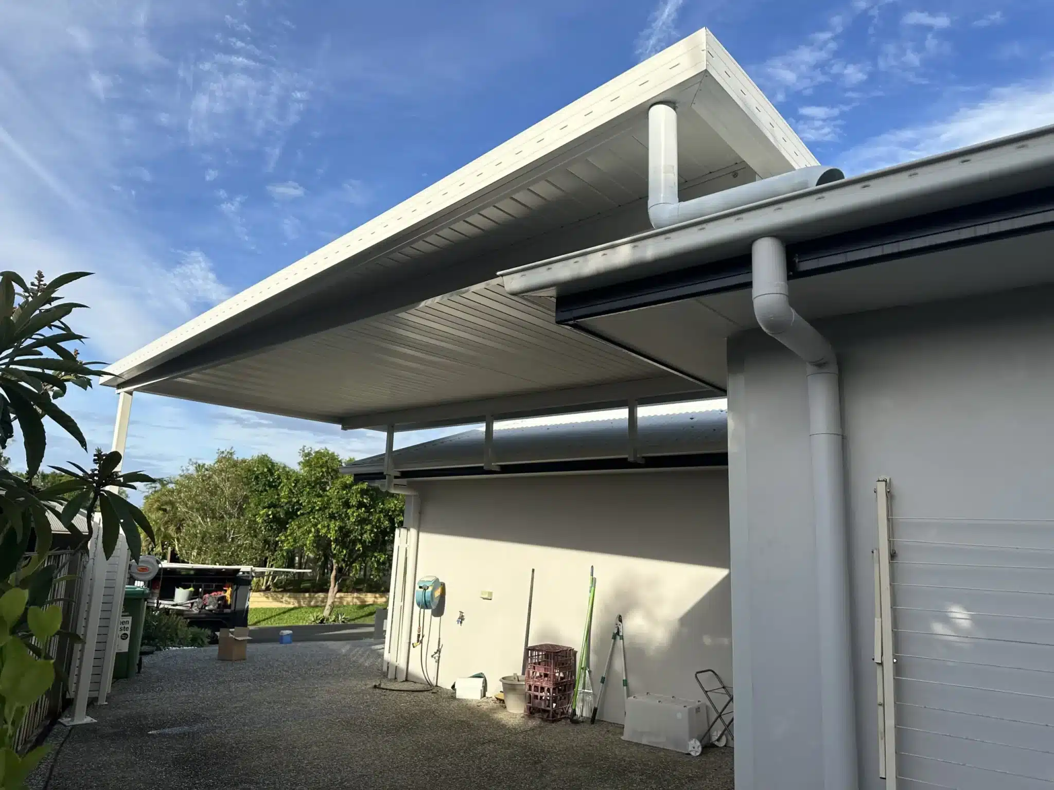 At 6.9m wide, the carport tapers from 4.8m to 3.9m to achieve precise positioning. Surfmist roof, ceilings, posts and gutters perfectly match the existing colour scheme of the home.