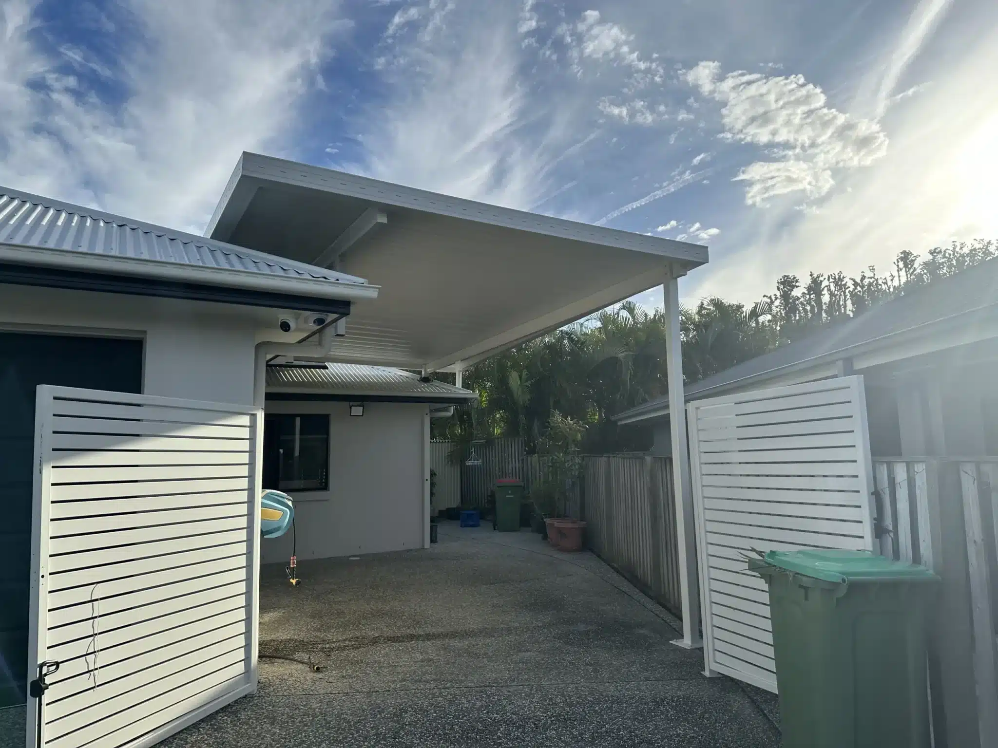 Our designers recommended an elevated roof line (flyover) to avoid closing off the space. Attached to the home, the new carport is mounted using a combination of through fascia brackets and a through eave post. This keeps the covered area clear for everything from parking to entertaining.