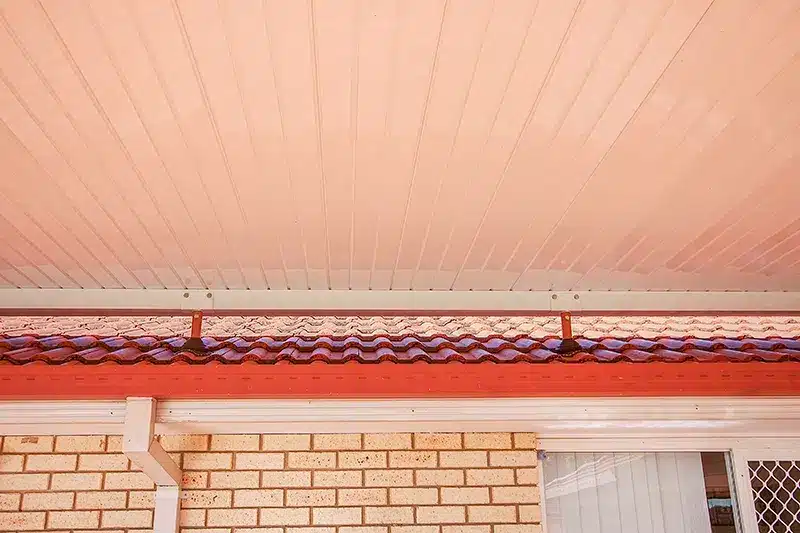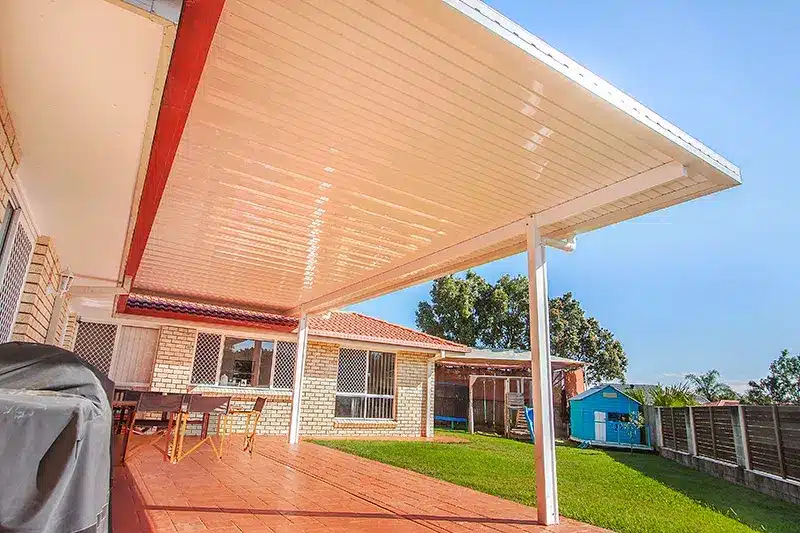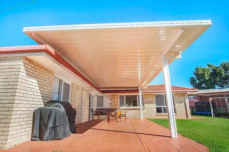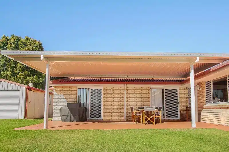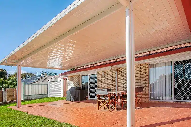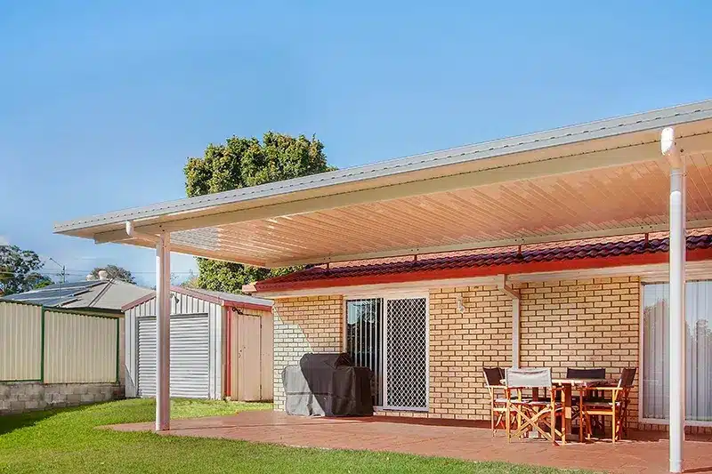 The single-skin steel patio is 9.7 wide and extends 4.8m from the home. Generous overhang prevents rain from entering the entertaining space. Using the home’s colour scheme for inspiration, the patio uses white posts and beams. The Surfmist-coloured ceiling is closely matched to the eaves and fascia.