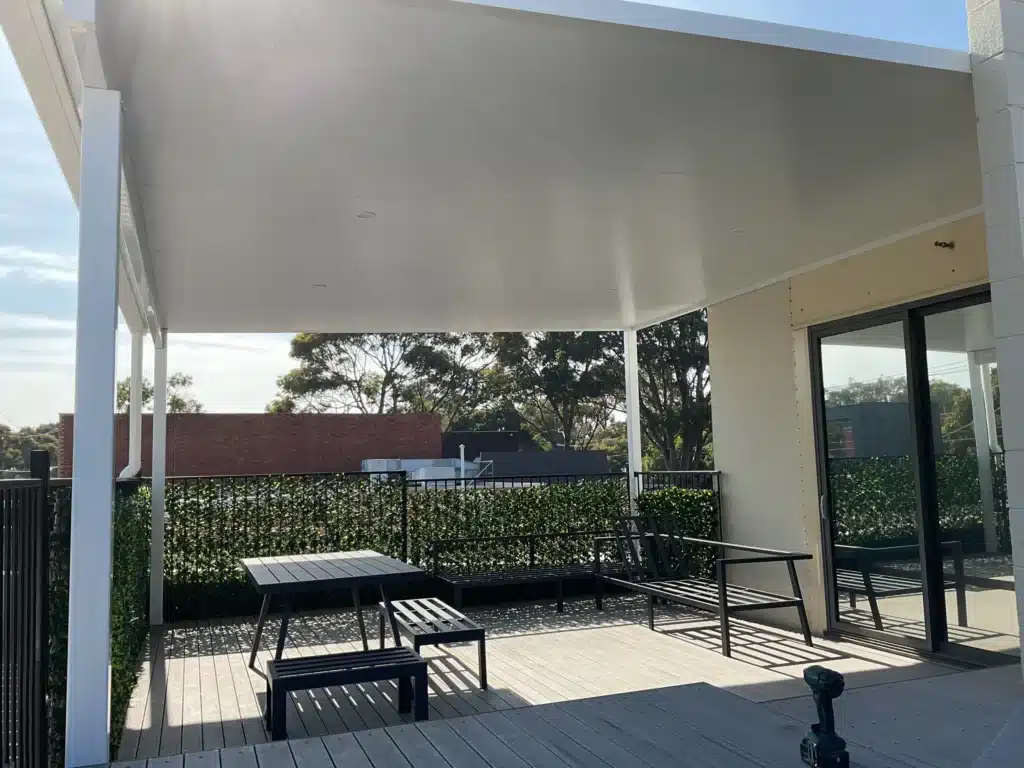 The insulated roofing panels allowed our team to span the full width of the existing deck. Measuring 5.9m wide and 4.9m deep, the 100mm posts were positioned at each end to keep things open and minimise visual clutter.