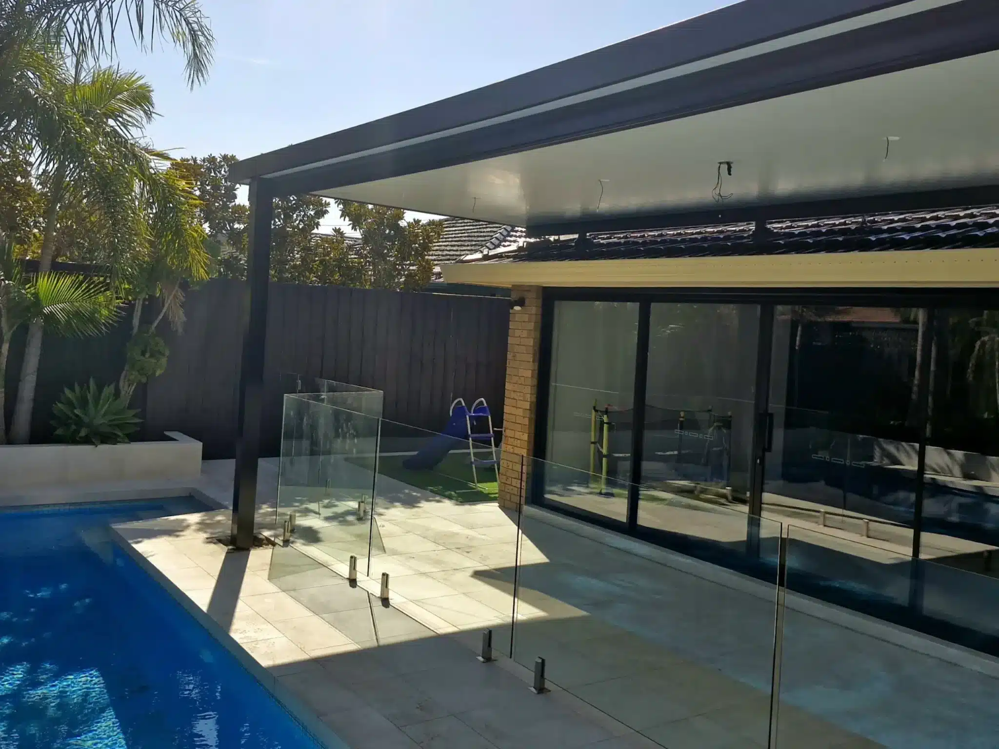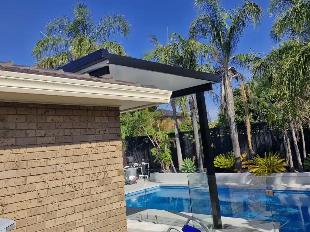 Framing the patio with 150mm posts delivers a modern look that beautifully matches the existing colours of the home and yard. The result is a stunning outdoor space to relax between swims.