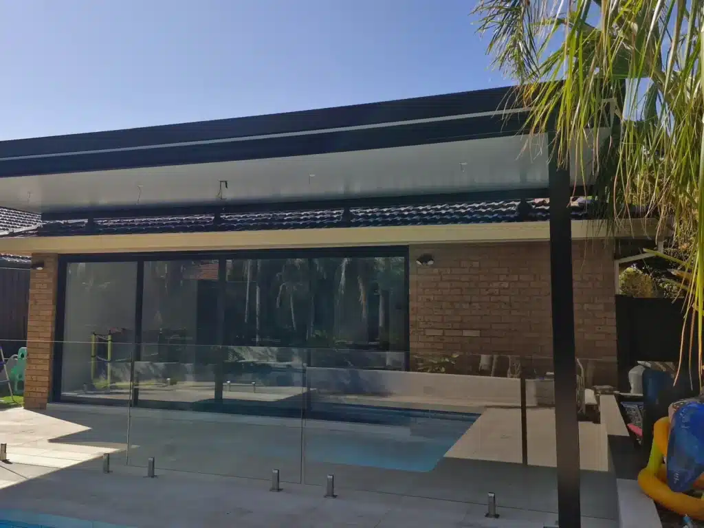 Positioned entirely across the newly installed stacking sliding doors, our Melbourne design team opted for a flyover patio design. At 8.8m metres wide and 3.5 deep, the new patio roof offers plenty of coverage and protection from the sun and rain. The overlap means the patio doors can remain open regardless of weather and allow the indoors to flow out. The design also results in needing fewer support posts further adding to the open look and feel.