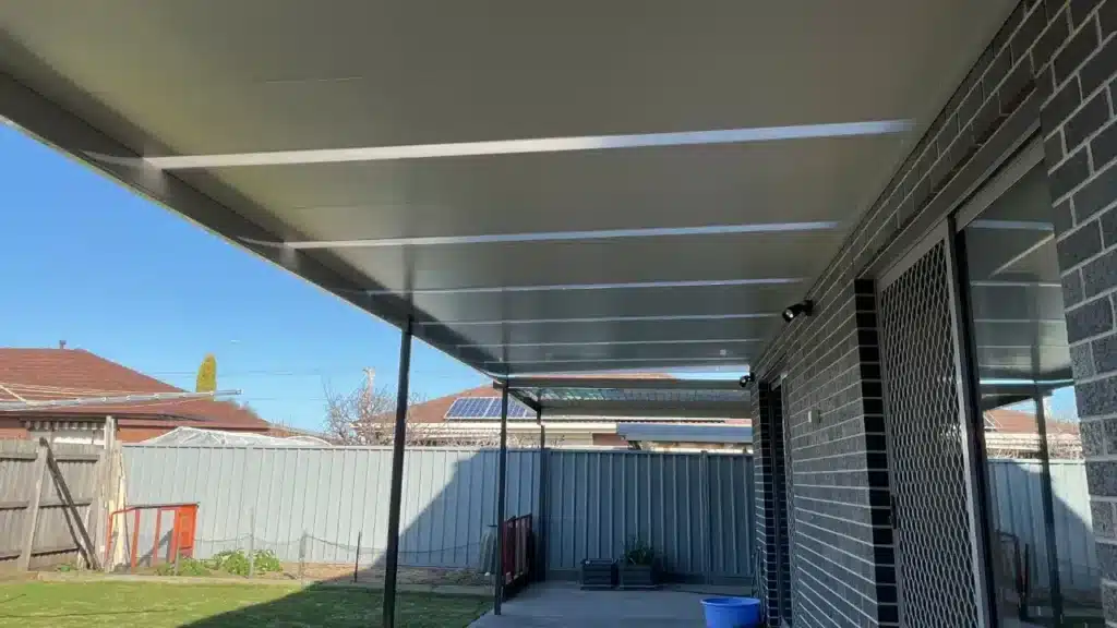 The rear patio uses insulated roofing panels combined with clear panels. This combination allows for additional temperature control and maximising the available light.