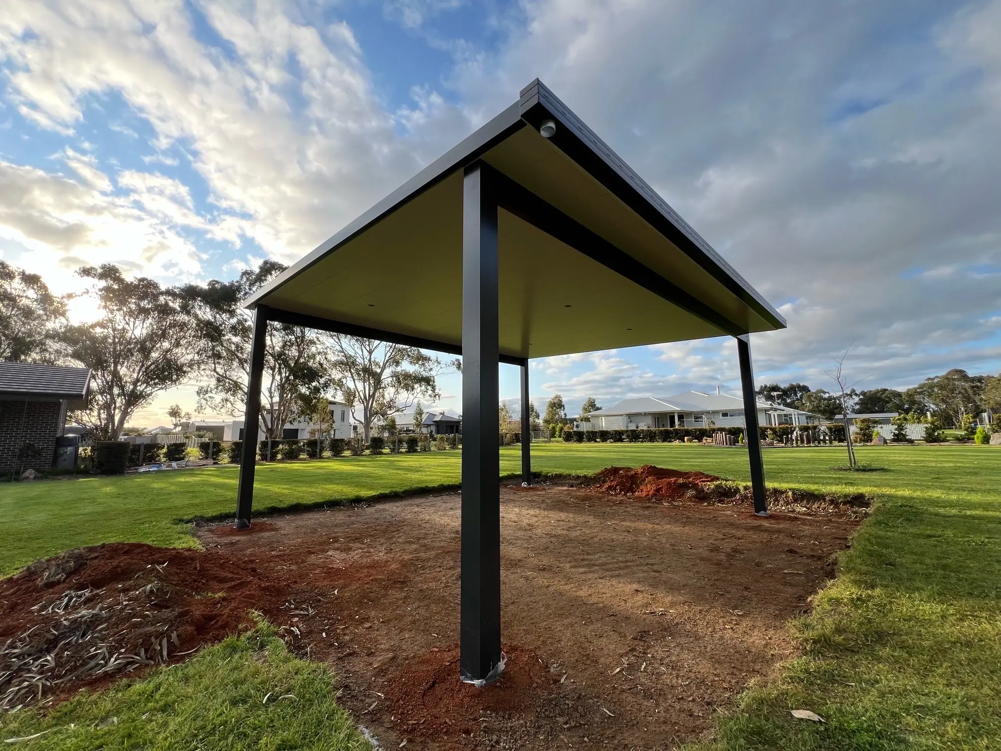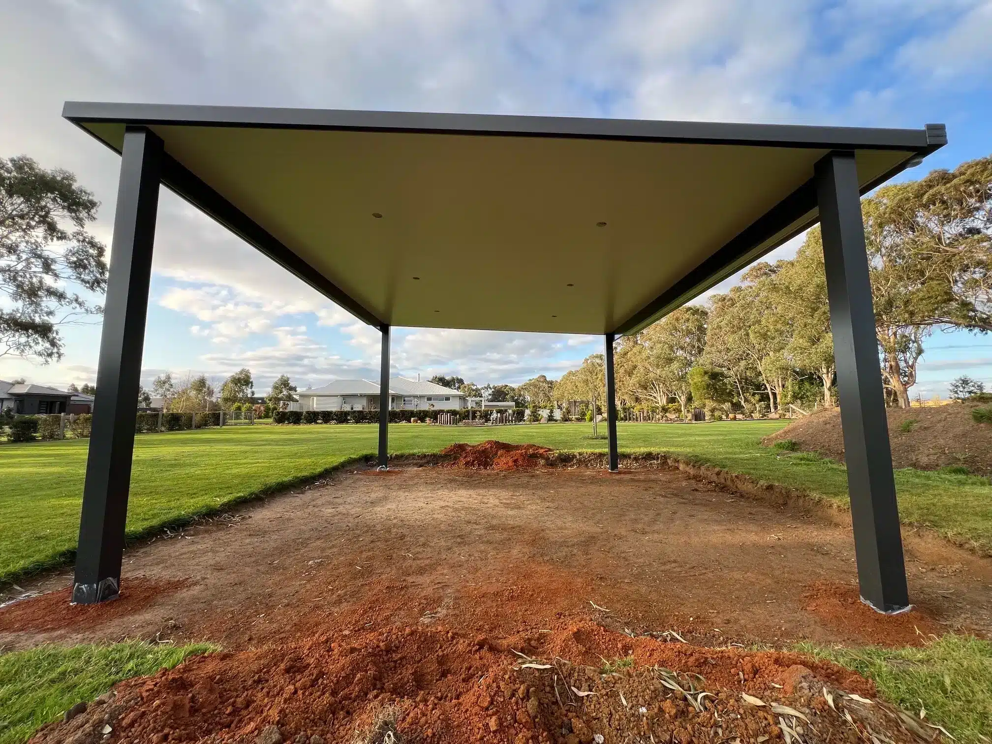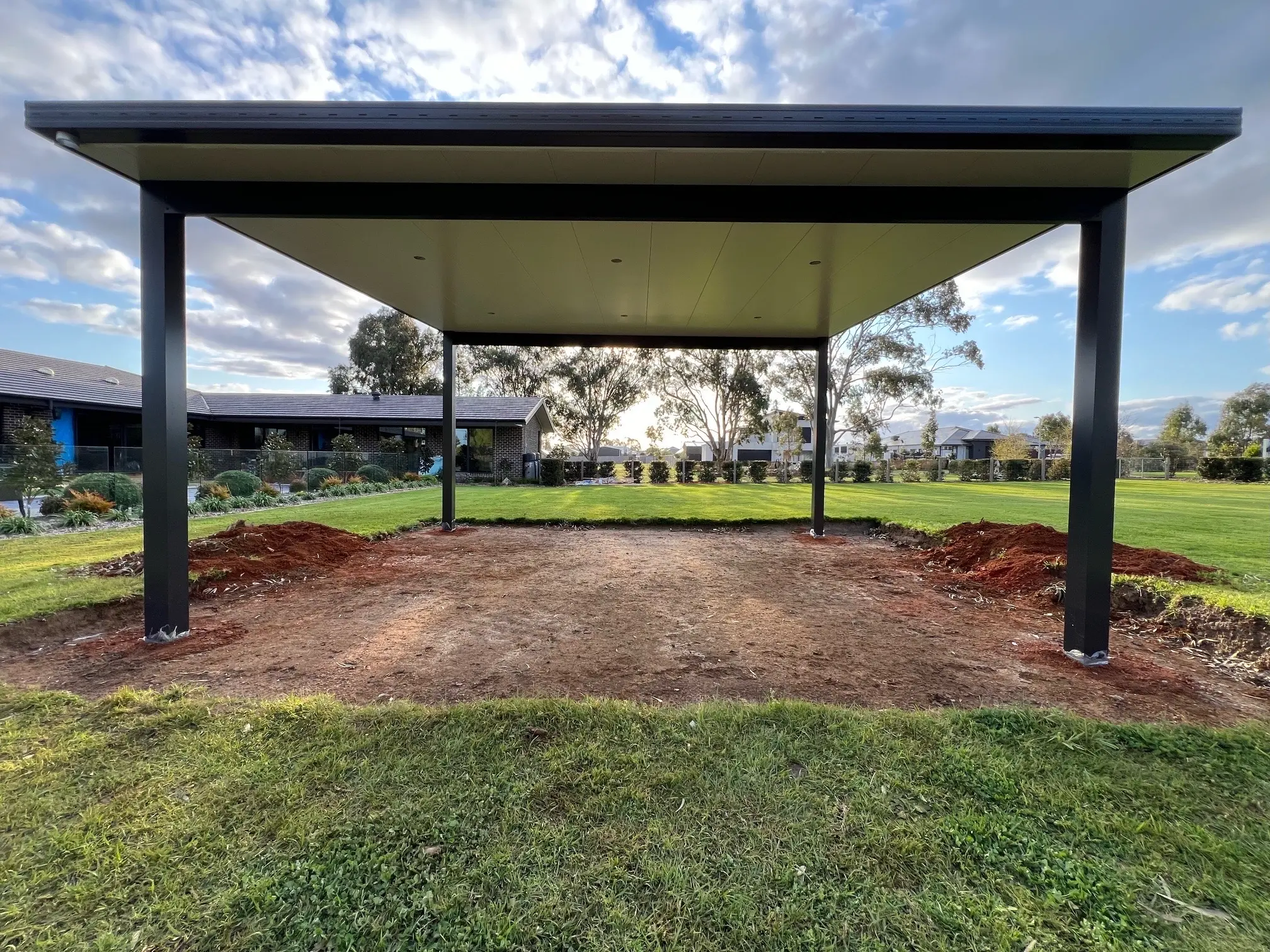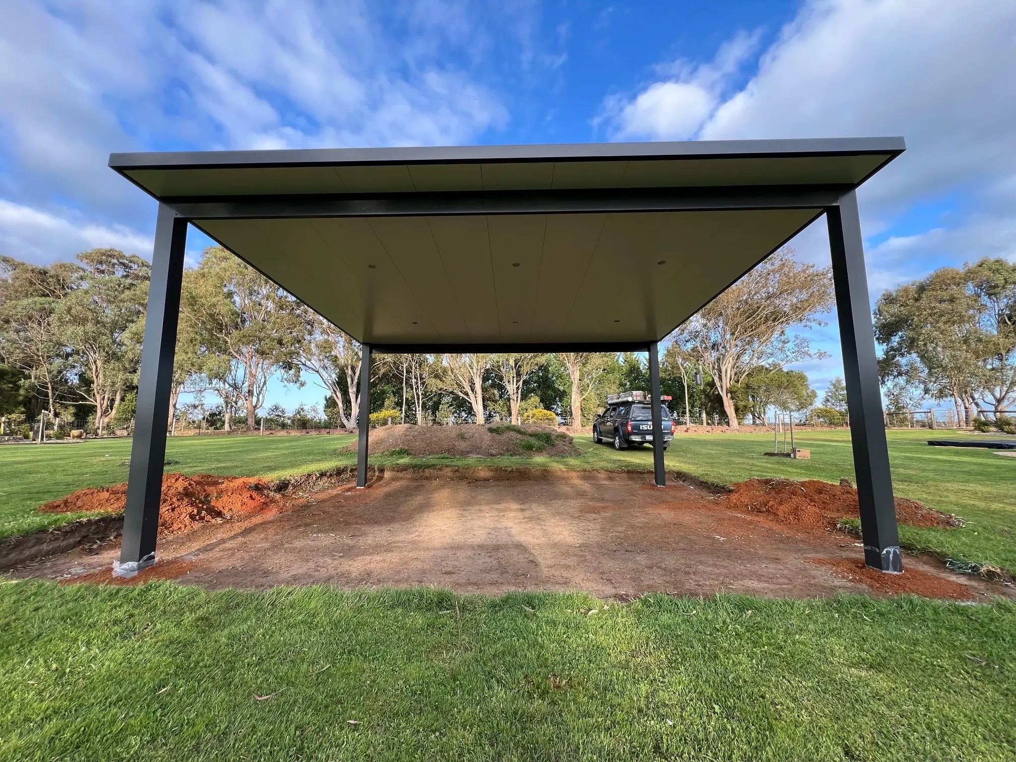 With site prep complete, 90mm square-profile posts were set in their foundations. They were then sleeved with 150x150mm aluminium posts for a bold appearance. Continuing the styling are twin 200x50mm beams, both finished in the popular Monument Grey.