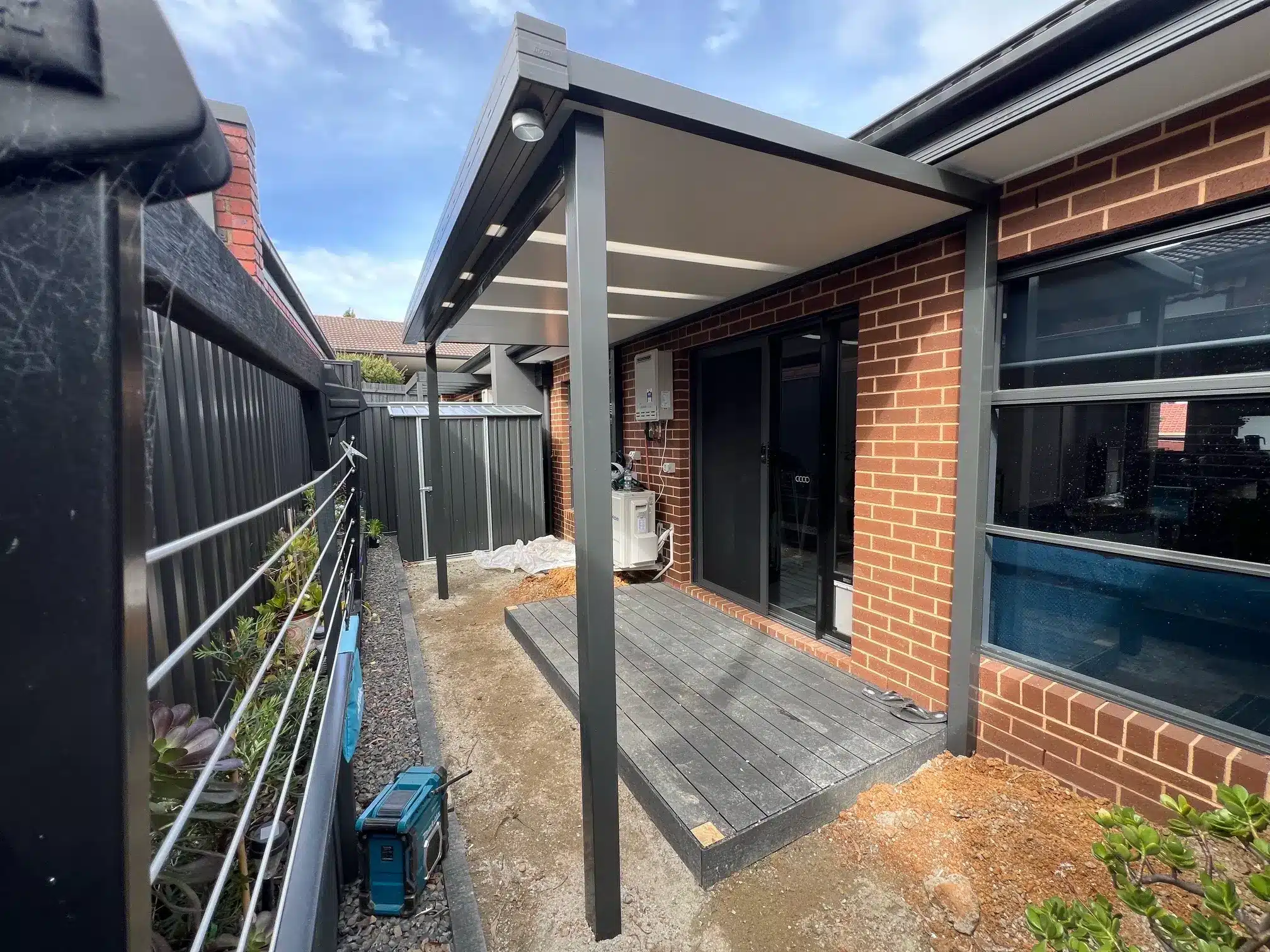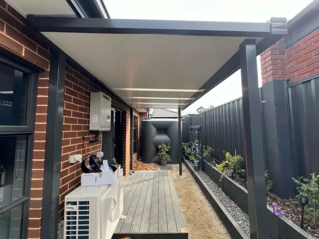 Built using 55mm insulated roofing panels, the verandah measures 2m x 4m. It features 3 opaque inserts to allow plenty of natural light to filter into the home. 90mm posts are matched with a 125mm beam and finished in Monument Grey and perfectly match the existing fence, gutters and window frames.