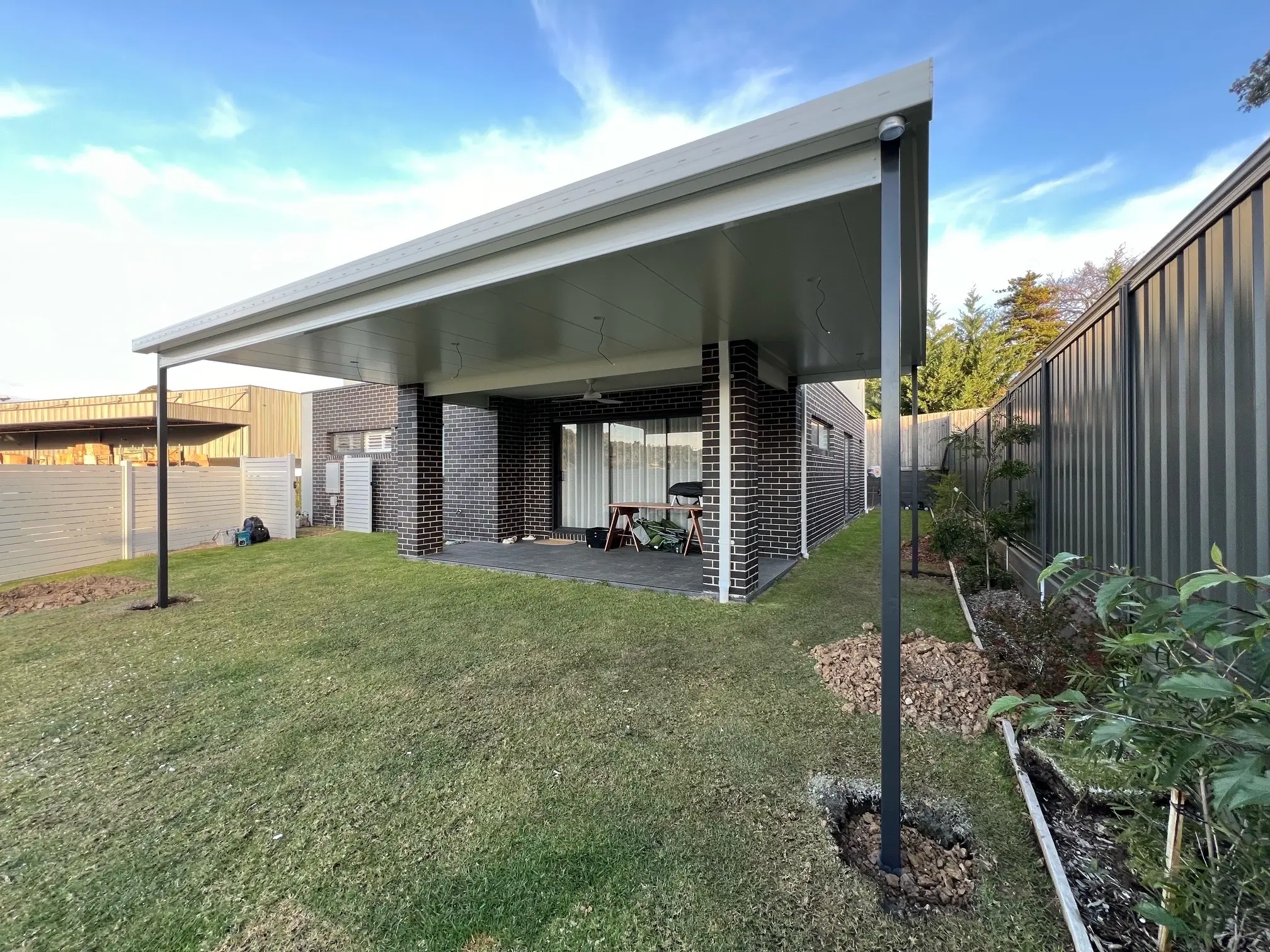 Stage 1 involves an L-shaped, fascia-attached insulated verandah. At its widest point, the new verandah is 7.2m wide and wraps around the alfresco area providing 5.5m of cover. The 55mm Insulmax Insulated Roofing panels protect from extreme temperatures and allow the generous width without the need for a centre post. This cuts down on visual clutter and delivers an uninterrupted view of the garden. White ceilings, roof, gutters and beams are a clean and modern colour choice. The Monument posts are paired perfectly with the steel fencing. When viewed from the right angle they almost disappear entirely from view.