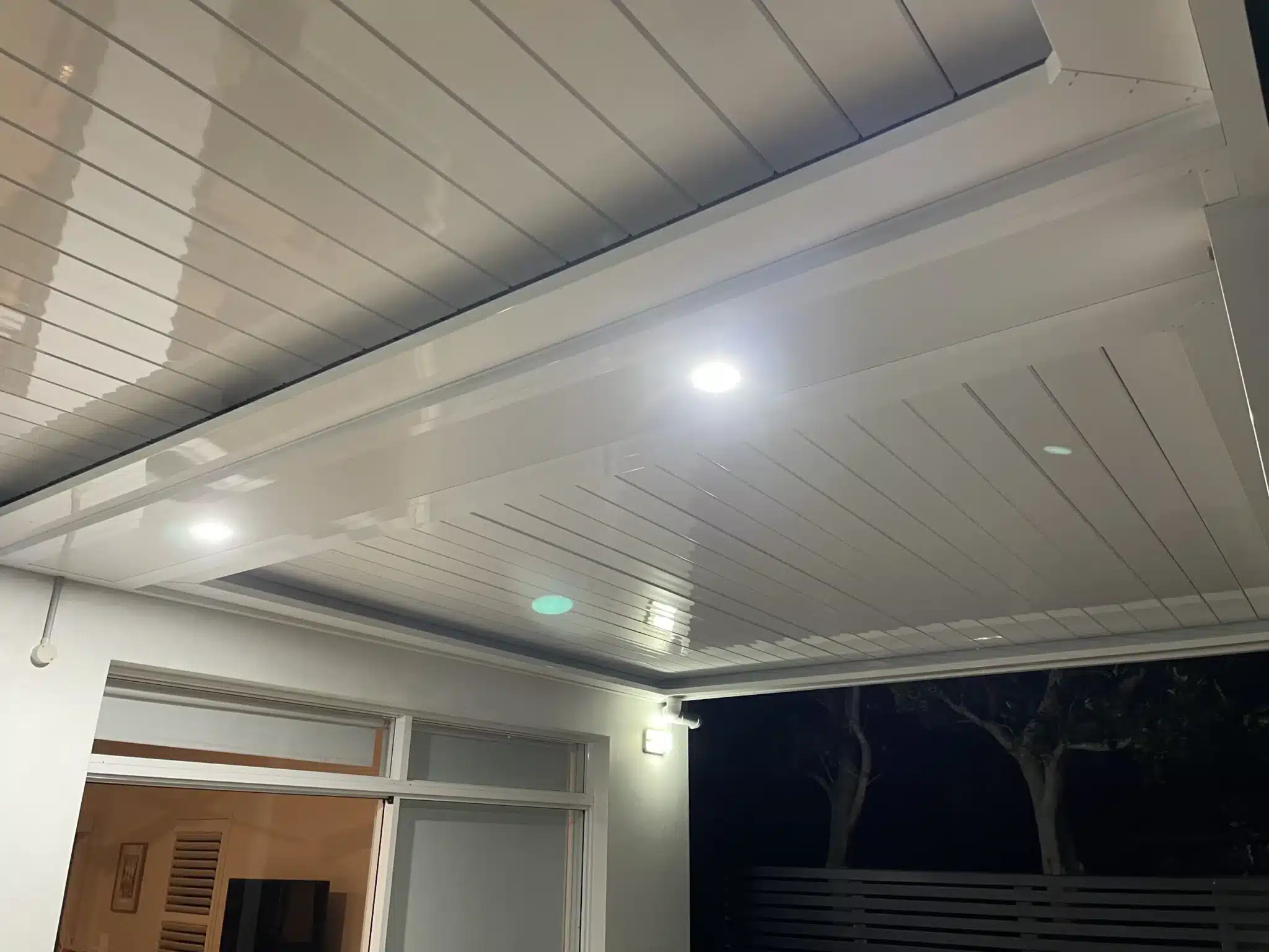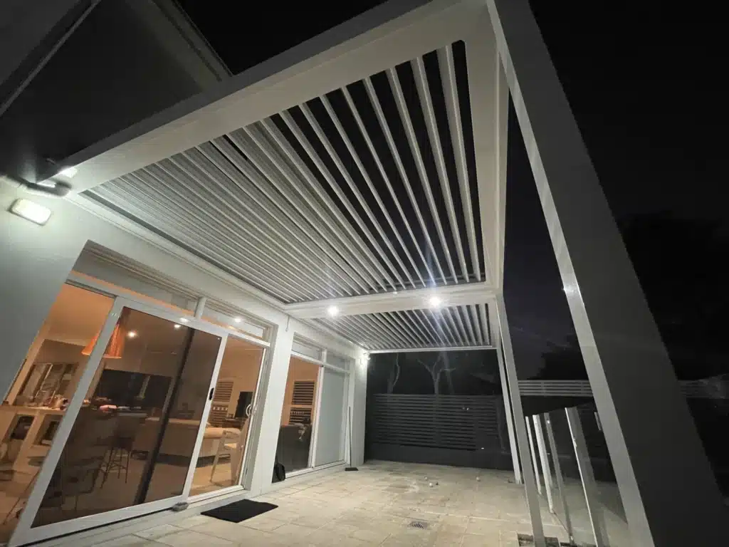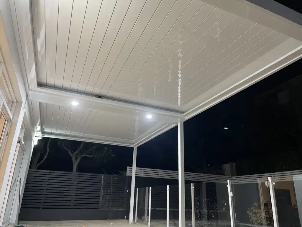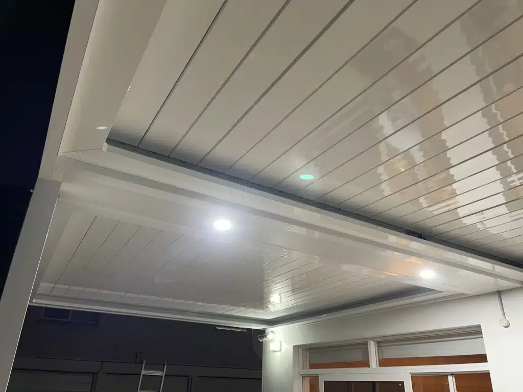 The new louvred patio is comprised of 2 roof sections and measures 7.4m wide and 3.7m deep. The use of two sections allows each to be adjusted independently according to our customer’s needs. The roofing arrangement also allows a central bulkhead to separate the sections. This provides an ideal location for flush-mounted LED lighting.