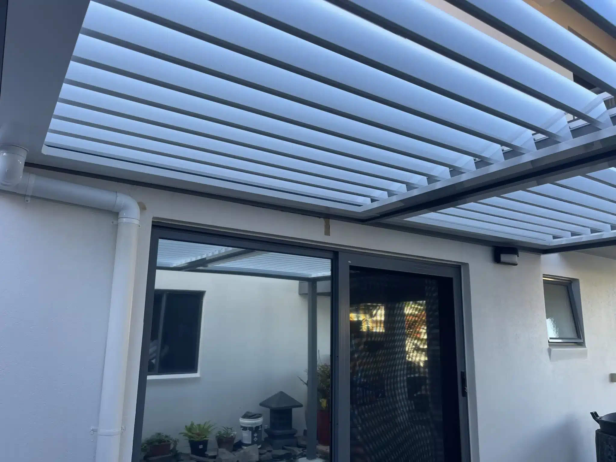 To match the elegantly finished home exterior, Basalt coloured posts and frames are used to support the bright white louvres and gutters.