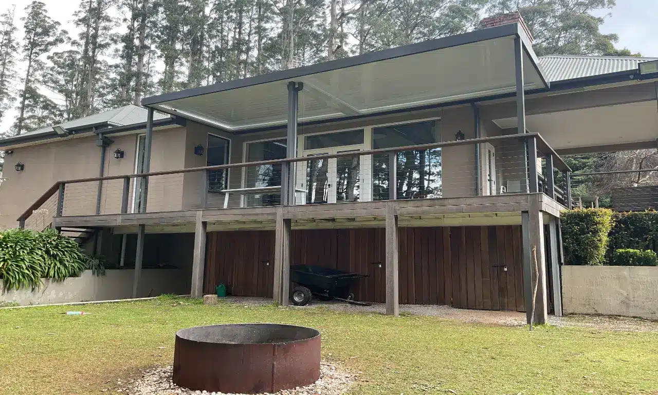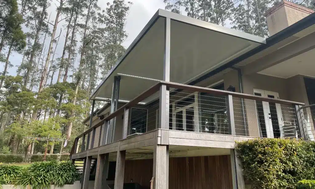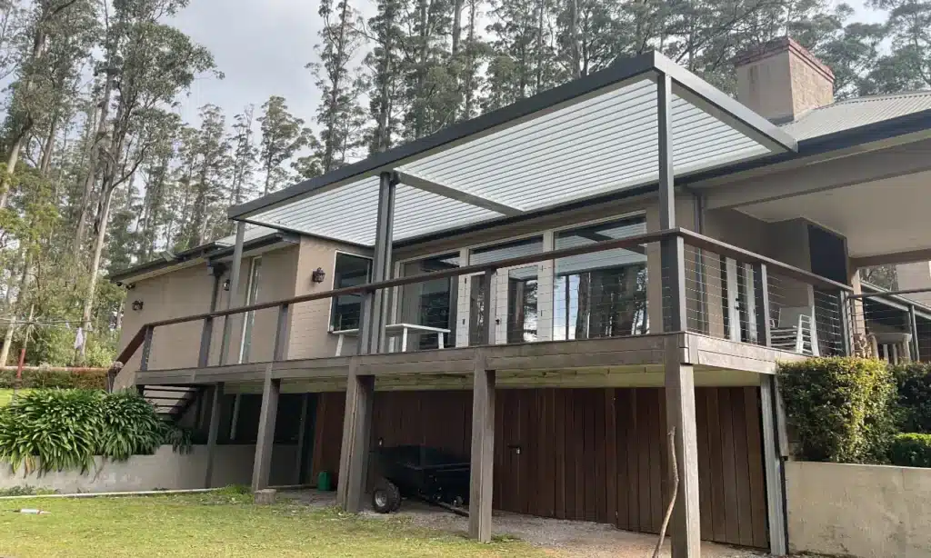 The 90mm square posts are finished in woodland grey and blend beautifully with the existing deck supports. The white gutters and louvres create a feeling of space and maximise natural light.