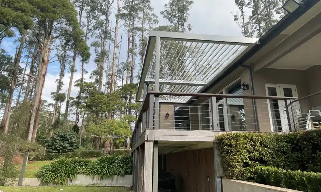 With careful consideration of the home and surroundings, our team designed this stunning louvred verandah. Custom through-fascia brackets were designed to suit the vaulted internal ceilings. Spanning almost the entire width of the deck, the verandah measures 8m wide and 2.5m deep and provides plenty of cover.