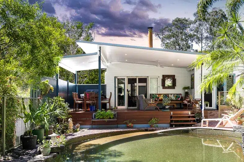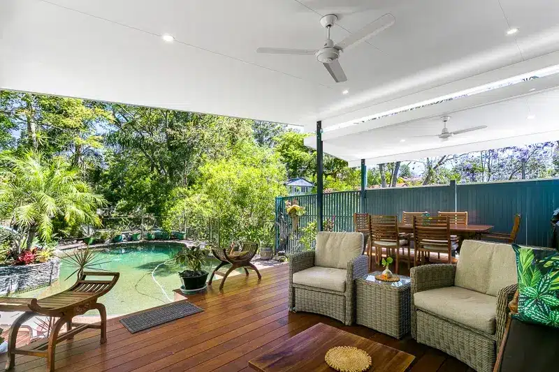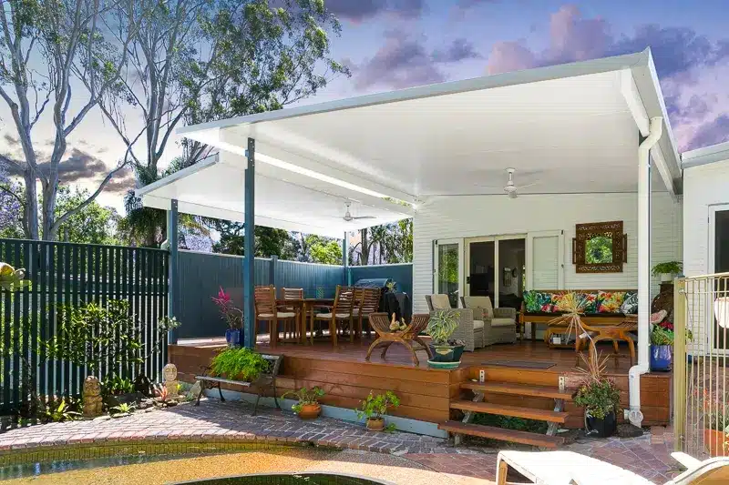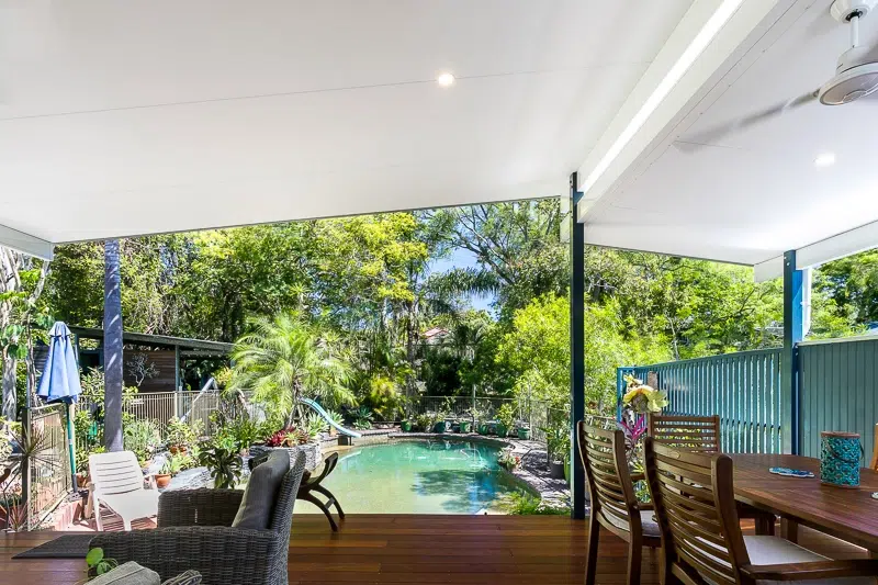 The main roof measures 6m wide and 5m deep. The smaller is 2m wide and 5m deep. Both sections are constructed using insulated roofing panels and feature flush mount LEDs and ceiling fans for 24-hour comfort, year-round. Crisp white ceilings are paired with Pale Eucalypt gutters, a nod to the lush greenery in the backyard. A stunning outdoor living combination that delivers big on function and character.