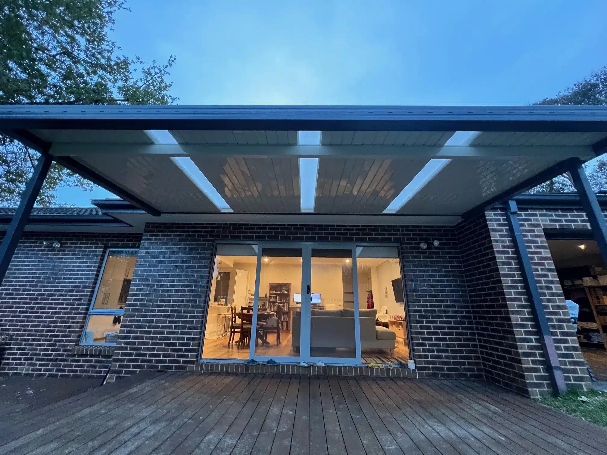 The steel outdoor roof is finished in white with a matching white support beam. Naturelite opaque inserts ensure plenty of natural light enters the home. Monument posts and gutters are matched beautifully to the existing colours of the home.