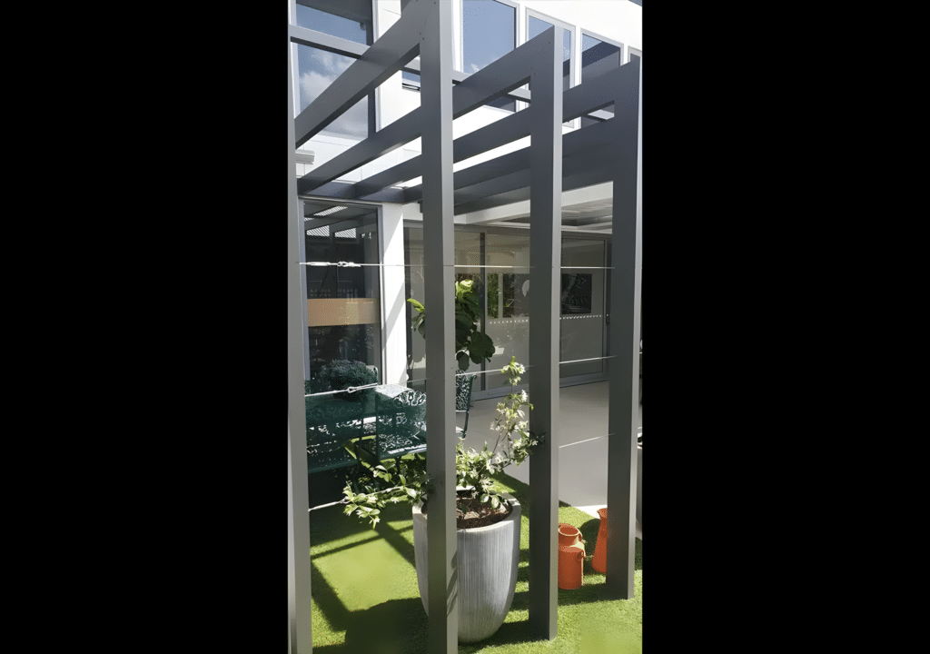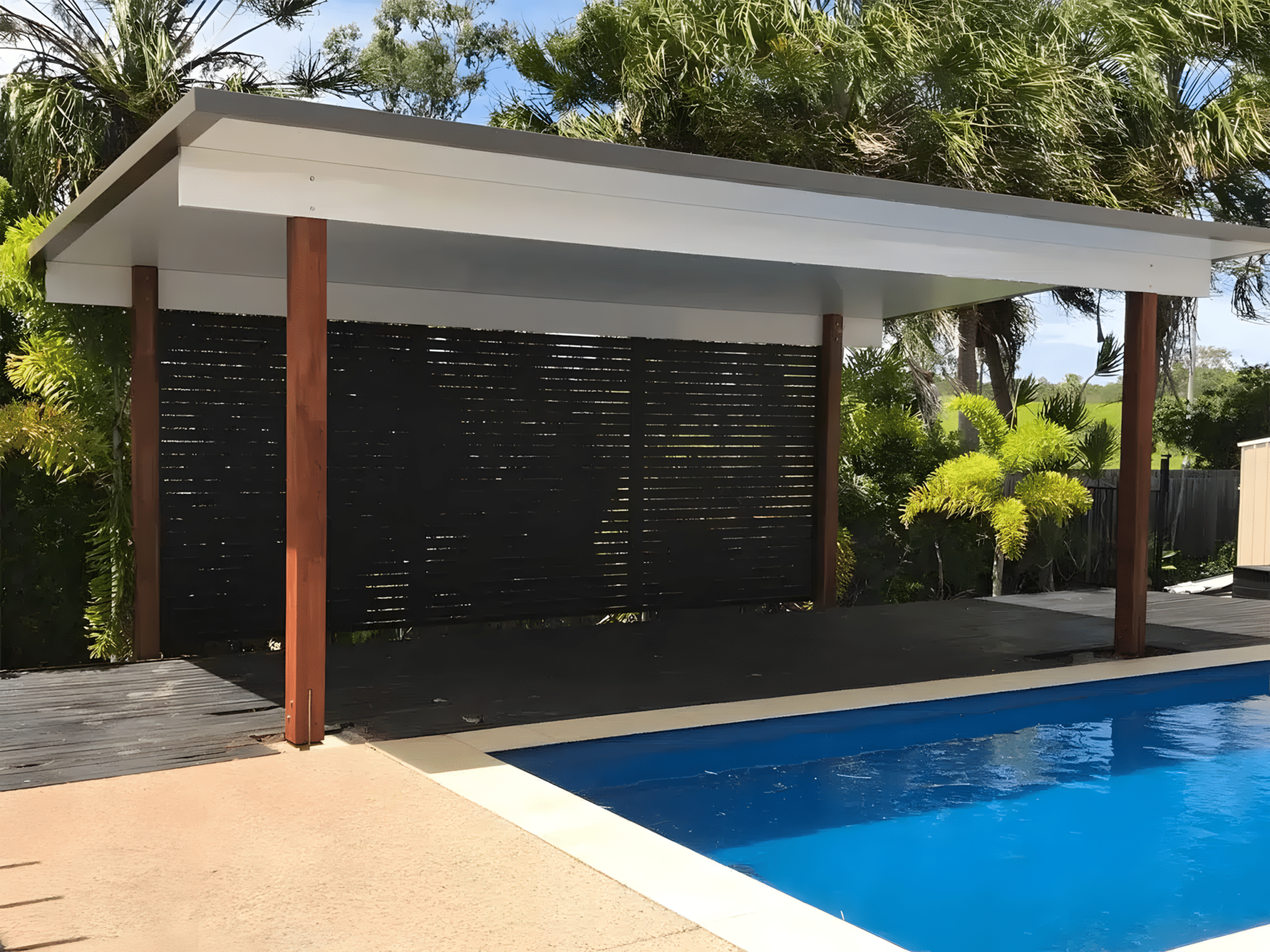 To create privacy for an area visible from the road or neighbours, we can design a pergola with laser-cut screening for added aesthetic appeal, built with low-maintenance, strong and future-proof aluminium sections such as posts and beams.